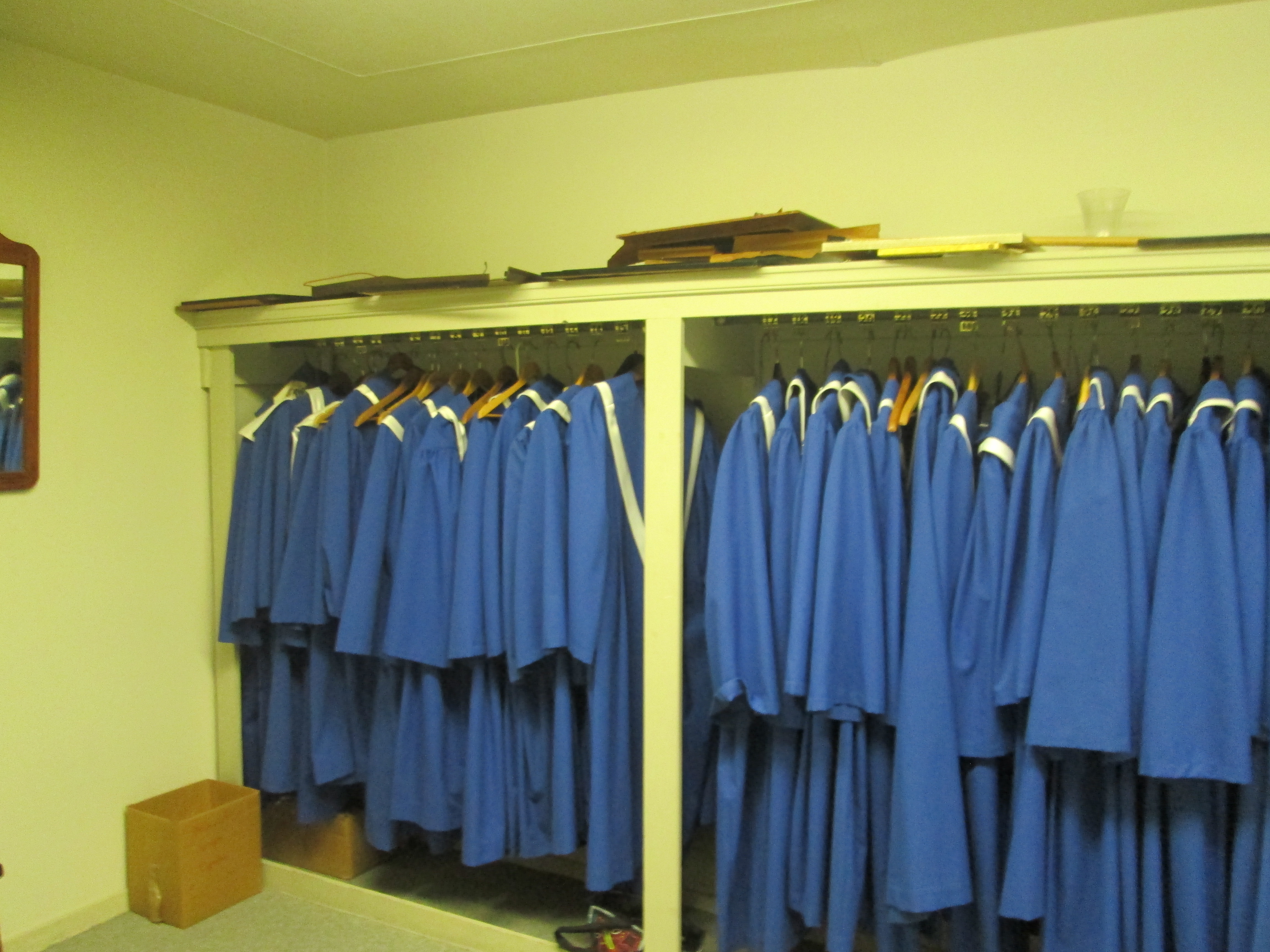 Up the main stairs, there was the choir room – still looking exactly the same with the robes hanging in their compartments and the shelves of choir music and folders.