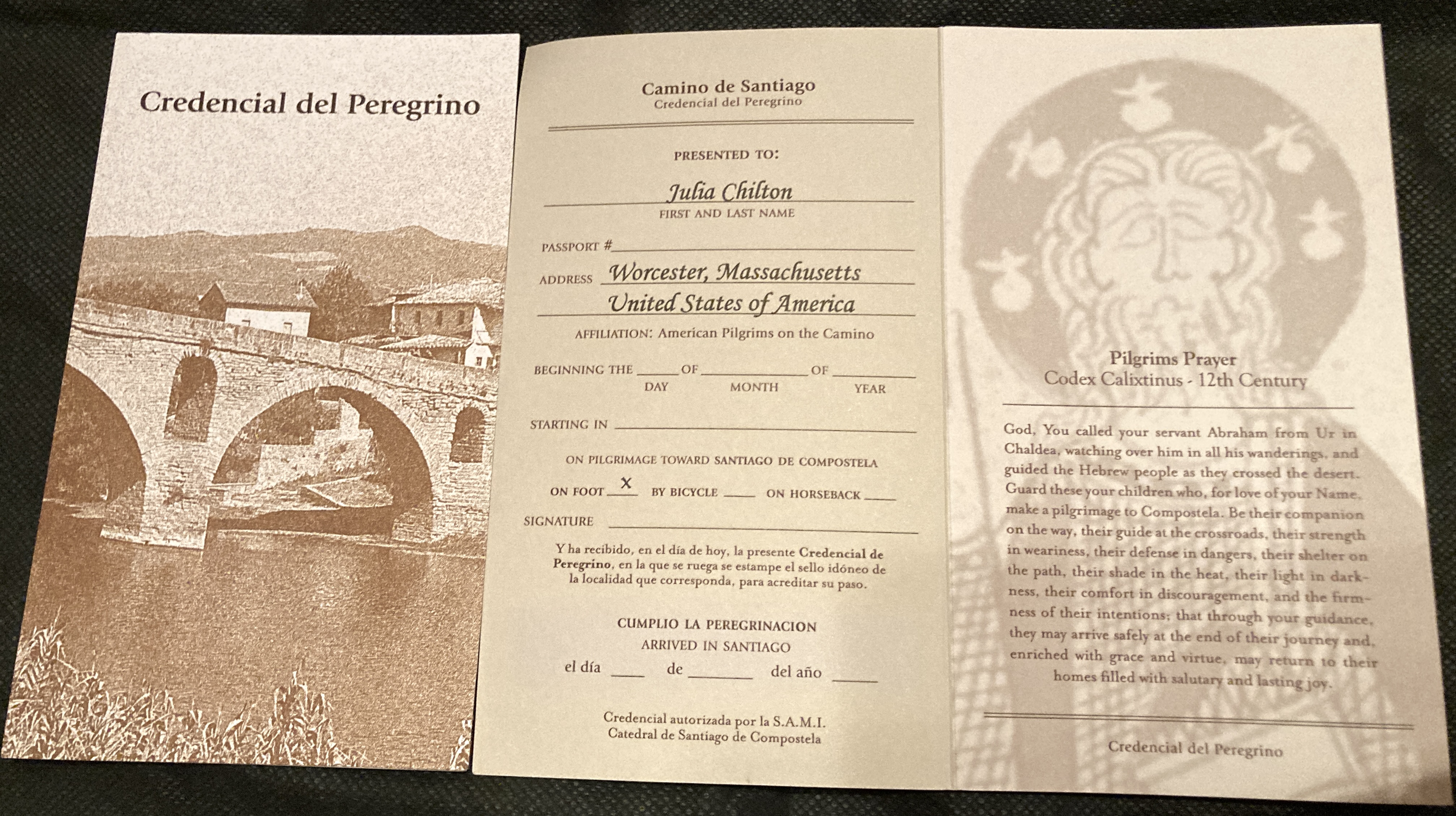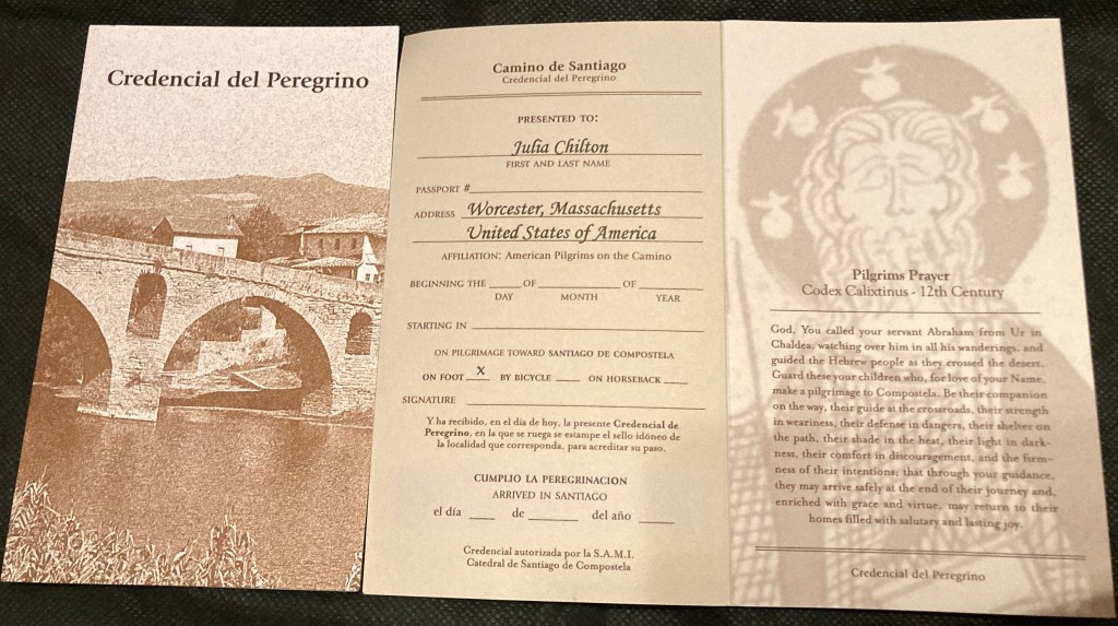 My pack is packed…final weight just under 14lbs. I’ve checked into my flight and filled out the required health form. I have my passport, vaccination card, credit card, ATM card and €50 in cash. I have my distance glasses, my reading glasses, a tiny notebook and pen and the all-important phone charger. Gloves, wool buff, wool socks and a sun hat. Sun glasses, too. And my Camino “Credential”, which will get stamped at every stop until I reach Santiago. Praying my heart, mind…and feet…are ready for the journey.