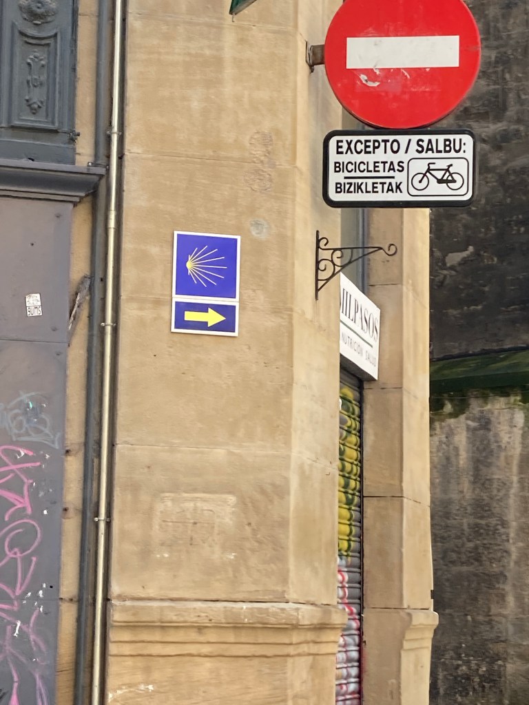 Thus fortified, I bundled up and went to find the “Caminoteca” – a local store with just about everything a peregrina could want or need. I got a pair of decent walking poles and a lightweight, string backpack. And of course, the requisite scallop shell. Met some other pilgrims, some who had started in St. Jean. Then I meandered around a bit and found a little cafe right near my hostel serving a fixed price meal…choice of starter, main, dessert, bread and wine. For €12. (That’s about $13.25.) I had a salad, eggs with “papas rostas” (ie: French fries) and some kind of incredible sausage. For dessert, I had some kind of cream thing with cinnamon and nutmeg. No picture because I ate it too fast!