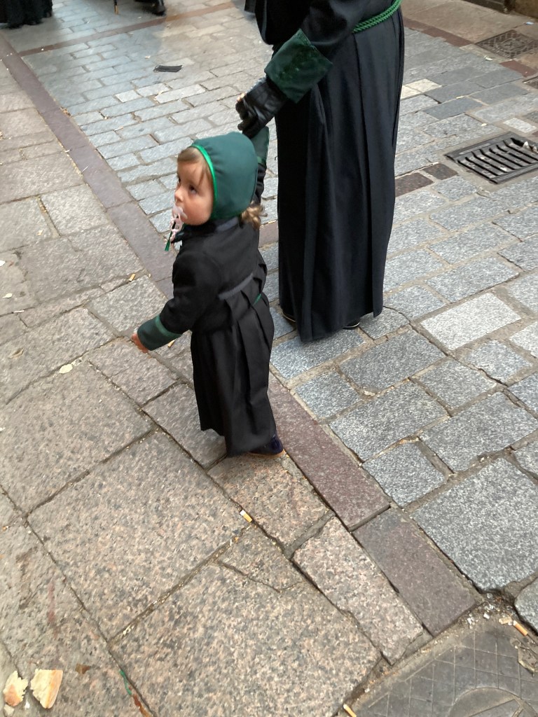 There was a procession just starting and people were lining the narrow way. Everyone had wine or beer and tapas were being passed around. Soon the drums and brass music began. The floats were pretty impressive. They were physically carried by at least 100 people, all dressed in the traditional costume of the penitent.