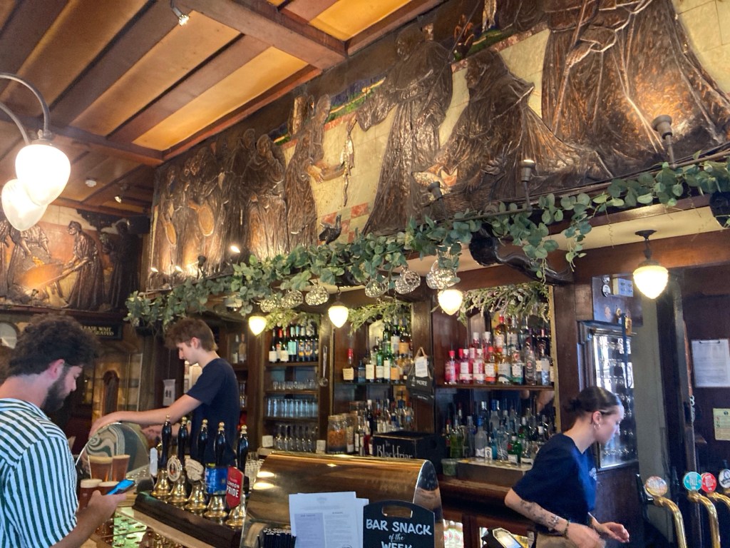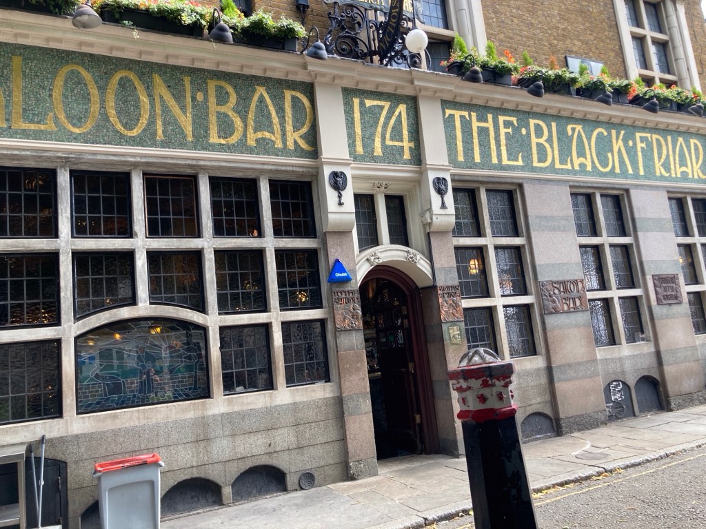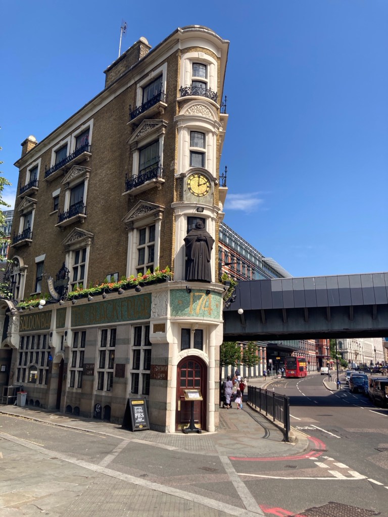Monday I had a lazy morning. The hotel offered a basic breakfast (with no real coffee, alas) so I took advantage of that and sat out in their back garden for a while. Finally I roused myself and took a bus down to Blackfriar’s Bridge, near St. Paul’s Cathedral. I was pretty hungry by then and in the mood for pub food. I found this very cool historic pub, right in the middle of everything. Excellent food, good real ale and fascinating history! (There is also a ghost, apparently!)