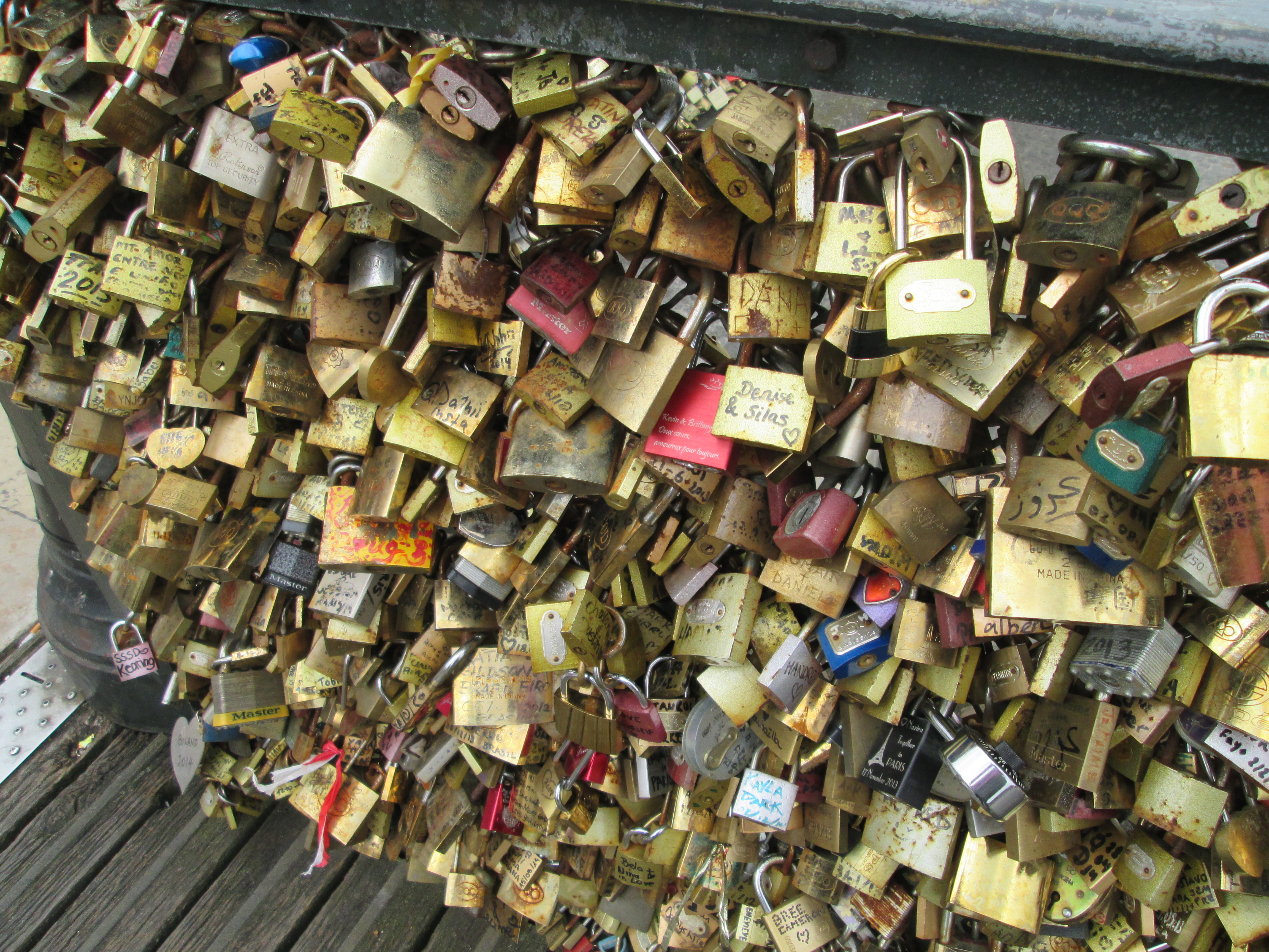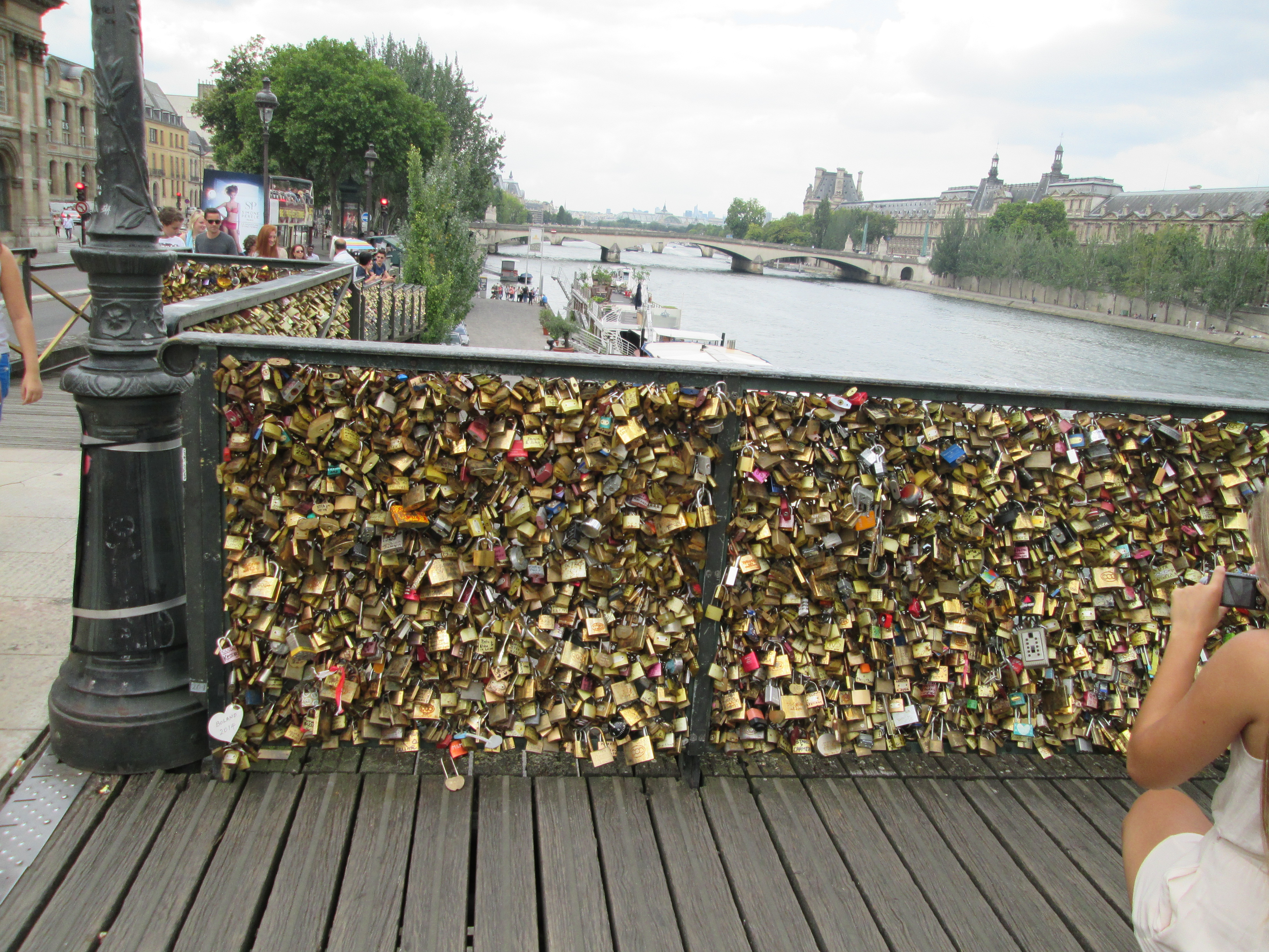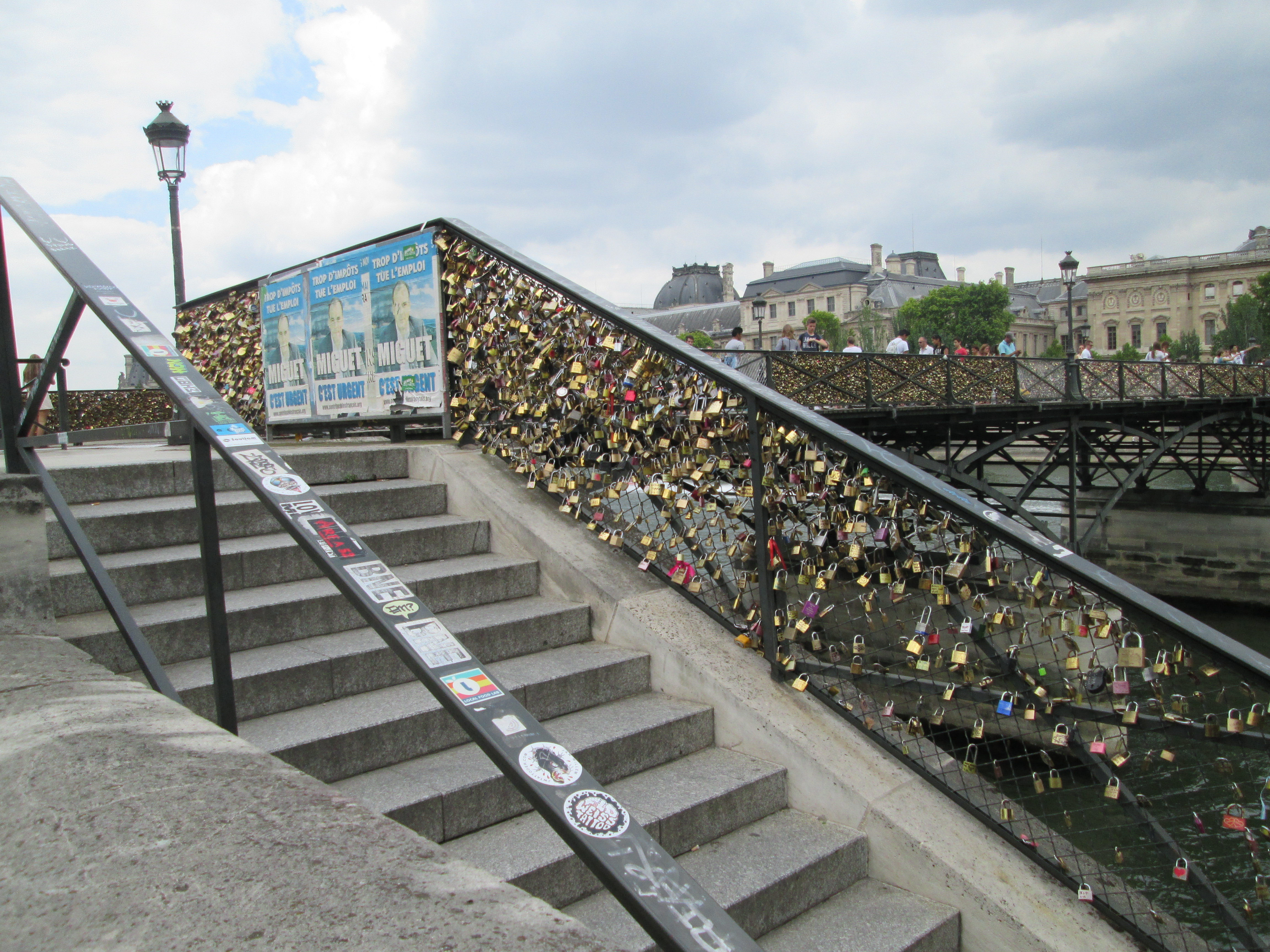 I then continued my walk along the Sienne. There are beautiful bridges and a walkway right down by the river. One of them is the famous “Pont des Arts” where it has become a tradition for lovers to “lock up” their love by putting a padlock on the bridge and then throwing the key into the river. IN recent years, this has become a problem, as there are now so many locks on the bridge that there is danger of collapse and rust from the locks is leaching into the Sienne. Apparently, a portion of the railing actually did collapse this past June and was replaced by plywood. There has been talk of trying to ban the practice of placing locks, but to my eyes, this has not had much effect.
